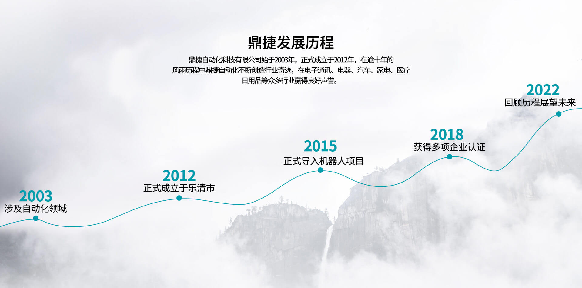 公司始于2012年,在逾十年的風(fēng)雨歷程中,不斷創(chuàng)造行業(yè)奇跡,在電子通訊、電器、汽車(chē)、家電、醫(yī)療、日用品等眾多行業(yè)贏得良好聲譽(yù)。公司坐落于浙江省樂(lè)清經(jīng)濟(jì)開(kāi)發(fā)區(qū),現(xiàn)有人員63人,擁有經(jīng)驗(yàn)豐富的工程技術(shù)研發(fā)團(tuán)隊(duì)11人,其中高級(jí)工程6人,具備本科以上學(xué)歷高級(jí)工程人員比例78%;同時(shí)鼎捷自動(dòng)化在蘇州,東莞等地設(shè)立分公司以服務(wù)目標(biāo)市場(chǎng)客戶,目前鼎捷自動(dòng)化已經(jīng)為下客戶提供配套自動(dòng)化解決方案:泰科、安費(fèi)諾、莫士、華為、中興、普聯(lián)、智英、意華、德豐、公牛、萬(wàn)事達(dá)、華豐、飛雕、普思、冠聯(lián)、俊朗松田、進(jìn)聯(lián)、高正、盛凌等。鼎捷自動(dòng)化專業(yè)從事連接器、開(kāi)關(guān)及相關(guān)電子、電器、五金、塑膠產(chǎn)品組裝自動(dòng)化定制、設(shè)計(jì)、制造、銷(xiāo)售。2012年,鼎捷自動(dòng)化正式導(dǎo)入機(jī)器人應(yīng)用項(xiàng)目,可為各類客戶提供電子、電器、汽車(chē)、五金、塑膠等集成自動(dòng)化智能組裝系統(tǒng)。